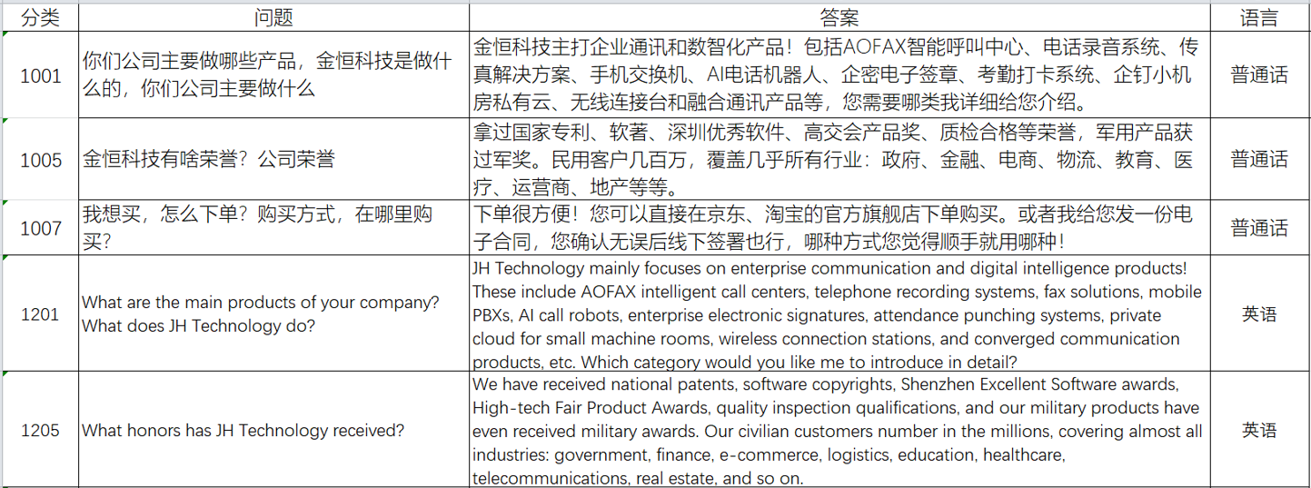 4、自主学习能力:不用 AI 训练师,仅需客服文员对 EXCEL 格式的知识问答(如下图)进行录入与修改,后续长时间的拆分、量化、配对、标注及数据归类等繁琐工作,均由AI完成。在使用过程中,AI还会自动标注疑难问题,便于人工定期优化,提升AI问答满意度;